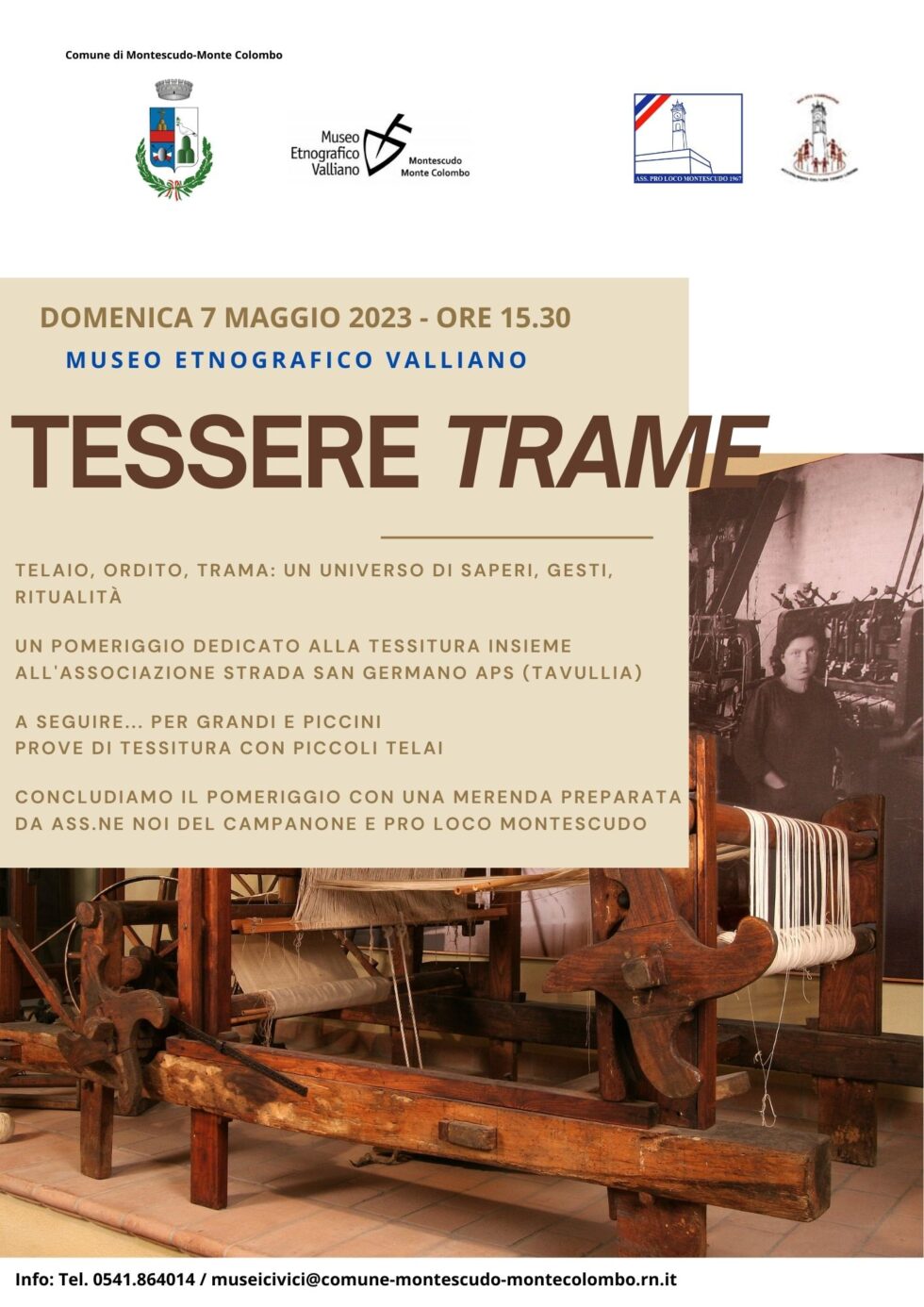 Domenica 7 maggio 2023, alle ore 15:30, il Museo Etnografico Valliano organizza l'evento "Tessere Trame", un pomeriggio dedicato alla tessitura in collaborazione con l'Associazione Strada San Germano APS di Tavullia.